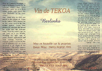 Tekoa, Berlinka, 1996: Made, as it was last year, primarily from grapes usually thought of as eating grapes, this low tannin, medium bodied wine has too low a bouquet and flavors that are best categorized as "confused". Despite its lack of charm, the wine has its followers, some of whom are pleased because the wine is made organically, and others who simply enjoy being different. Although the wine is drinkable, I wonder why anyone would bother. Depending on where you find it, NIS 55 - 80. Score75.