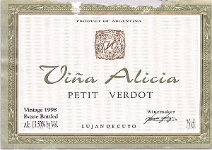 I found this wine extraordinarily satisfying. It has a complex silky-smokey texture. I brought it to an 'offline' (meeting of people who met through the web) at a London restuarant. Tom Cannavan subsequently described it on his website thus "Lujan de Cuyo (Argentina) "Alicia" Petit Verdot 1998