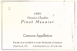 This is a very rare example of a varietal Pinot Meunier wine, made by Domaine Chandon in California. Domaine Chandon, owned by the Moet Chandon Champagne house, was one of the first of several French companies to plant vineyards and build wineries in California to make sparkling wine. I visted the winery in the seventies and was very impressed with the quality of the fizz.