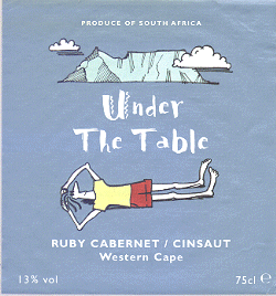 Amusing pun; the table is Cape Town's Table Mountain and the young man is supposed to be relaxing on the beach. Ruby Cabernet is a recent Cabernet Sauvignon - Carignan cross which the back label optimistically calls South Africa's own grape although it has insignificant plantings there. The featured young man seems to travel a lot, we've seen those legs and red shorts before - see Scraping the Barrel.