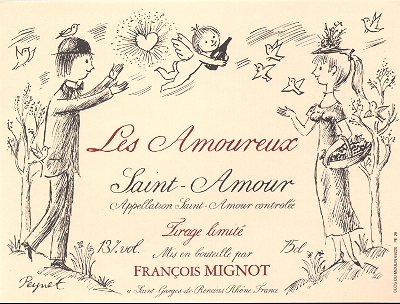 A charming and appropriate label from cartoonist Peynet for this bottle of Beaujolais from the Saint Amour appellation.