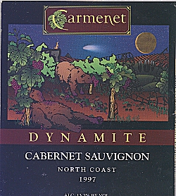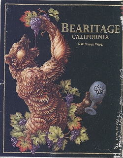 Another great label with bears. They use dynamite at Carmenet to gouge paths out of the solid mountain rock, and have to chase out bears who crash the fences to get at ripe Cabernet grapes. The label refers to this, and also to more heavenly events. This is the 1997 vintage - the year the Hale-Bop comet blazed through the skies over California during an eclipse of the moon. Notice the drunk bear asleep under the vines at the left.